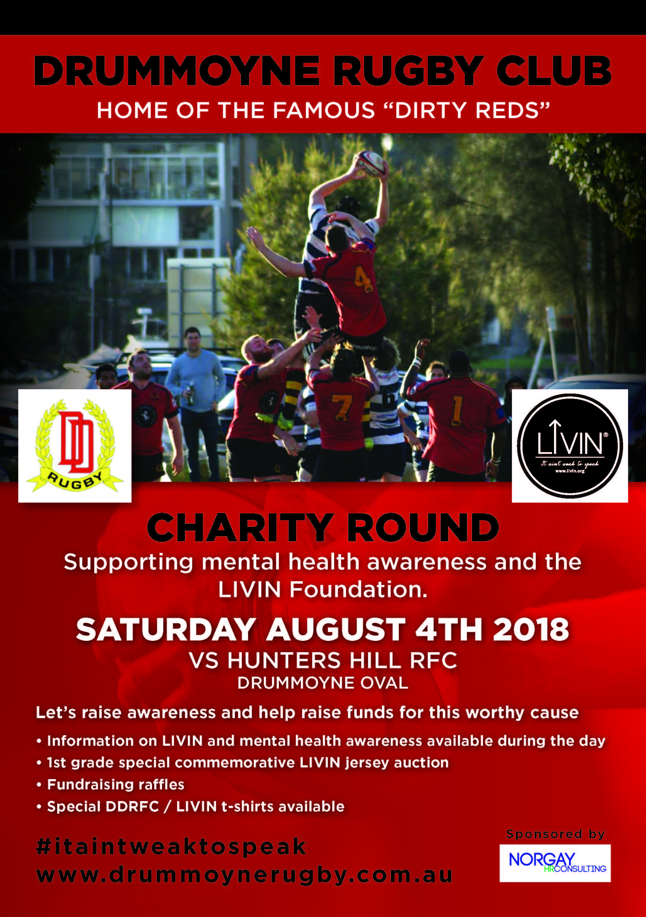 The Drummoyne Rugby Club began it’s support of LIVIN in January through the tragic loss of one of the teams beloved players, P.J Hahn. The clubs commitment to spreading the message about speaking up about mental health has continued and on the first weekend in August, are inviting the local community to come along and support their Charity Round in support of LIVIN.